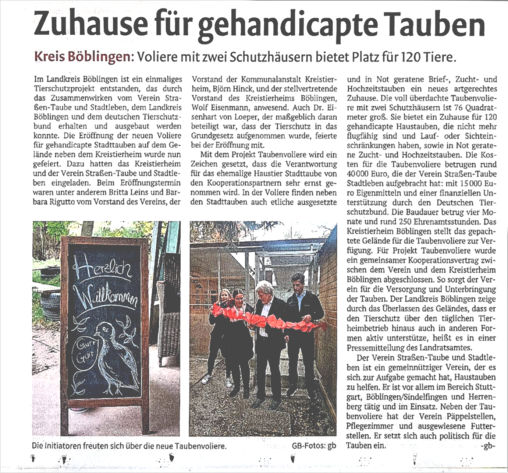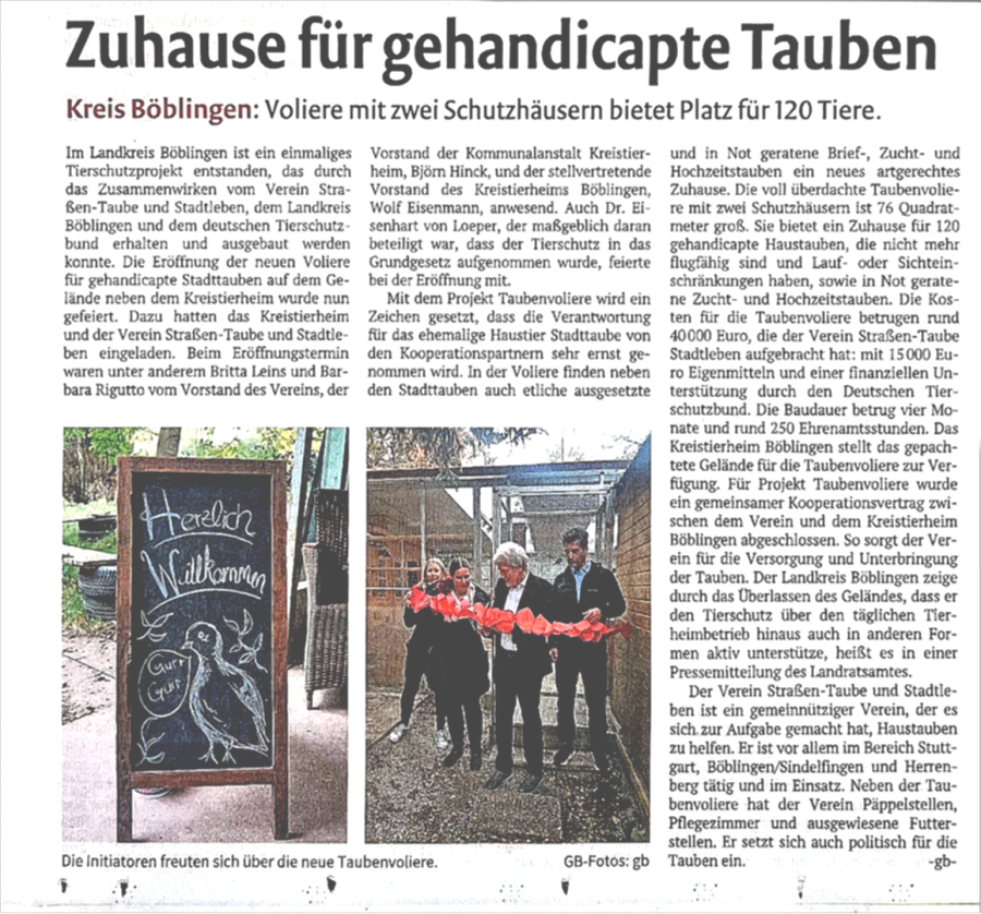 Wir - und unsere behinderten Täubchen - sind überglücklich, mit dem Kreistierheim Böblingen und dem Landkreis Böblingen einen zuverlässigen Partner für einen neuen Standort unserer Behindertenvoliere gefunden zu haben.