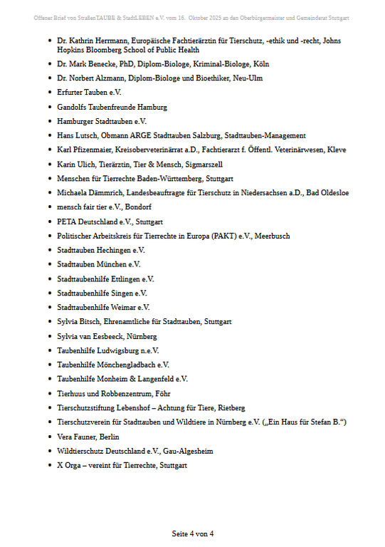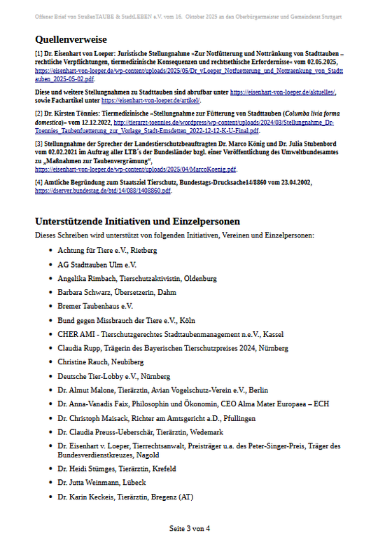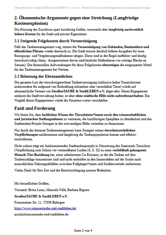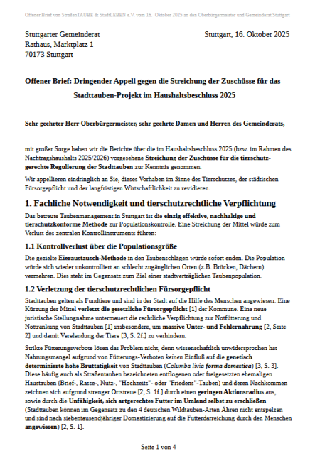In einem offenen Brief richtet unser Verein einen dringenden Appell gegen die Streichung der Zuschüsse für das Stadttauben-Projekt im Haushalts-beschluss 2025 an den Stuttgarter Oberbürgermeister und die Gemeinderät*innen. Sie finden den offenen Brief, der von zahlreichen Stadttauben-Initiativen und Tierschutzvereinen sowie Einzelpersonen unterstützt wird, hier (siehe PDF):
