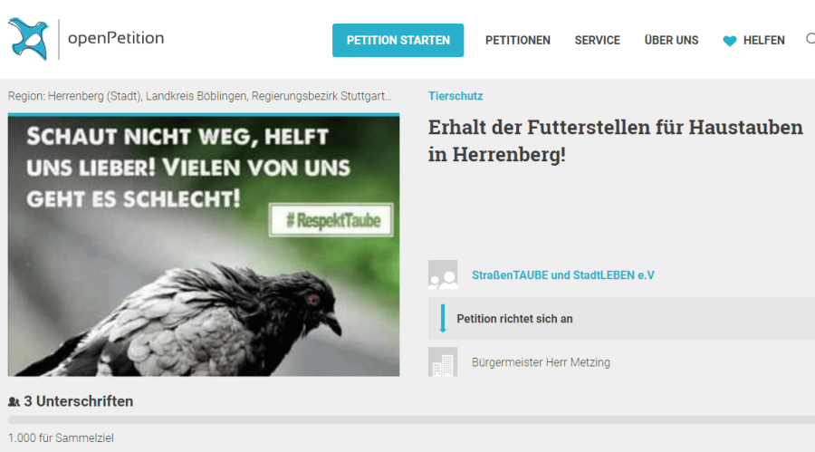 In einem offenen Brief richtet unser Verein einen dringenden Appell gegen die Streichung der Zuschüsse für das Stuttgarter Stadttauben-Projekt im Haushalts-beschluss 2025 an den Stuttgarter Oberbürgermeister und die Gemeinderät*innen. Sie finden den offenen Brief, der von zahlreichen Stadttauben-Initiativen und Tierschutzvereinen sowie Einzelpersonen unterstützt wird, hier (siehe PDF):