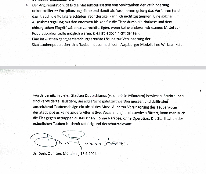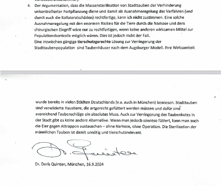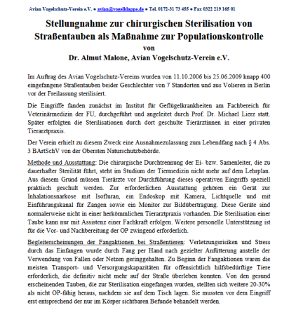 Dr. Almut Malone, Avian Vogelschutz-Verein e.V. (Berlin, 10.12.2024): In ihrer Stellungnahme legt Dr. Malone dar, dass die chirurgische Sterilisation als Maßnahme zur Populationskontrolle strikt abzulehnen ist. Sie verweist auf das unverhältnismäßige Leid der Tiere und die mangelnde Nachhaltigkeit.