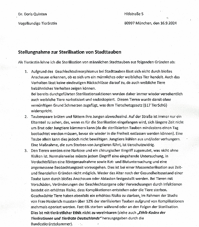 Dr. Doris Quinten (Vogelkundige Tierärztin): Detaillierte Analyse, warum die Sterilisation medizinisch und ökologisch scheitert und warum "unfruchtbare Männchen" den Bestand nicht senken. Siehe Stellungnahme Dr Doris Quinten