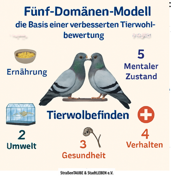 Das Wohlbefinden eines Tieres entsteht aus der Gesamtheit seiner körperlichen und emotionalen Erfahrungen. Moderne Tierwohlforschung betrachtet deshalb nicht nur die Vermeidung von Leid, sondern auch die Förderung positiver Gefühle wie Sicherheit, Neugier und soziale Bindung. Für Stadttauben – hochsoziale, anpassungsfähige und oft missverstandene Tiere – bietet das Fünf‑Domänen‑Modell einen klaren Rahmen, um ihre Lebensqualität umfassend zu bewerten und zu verbessern.