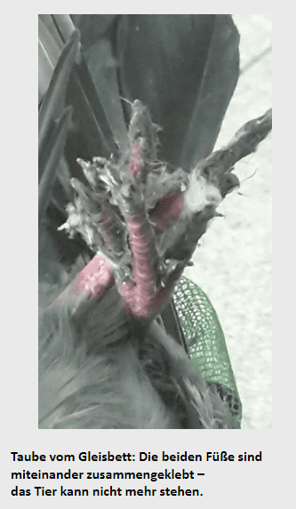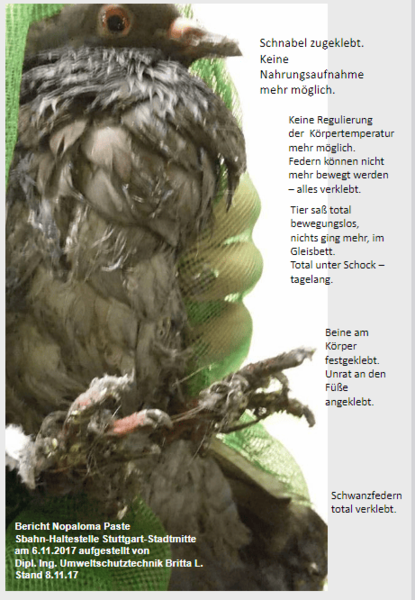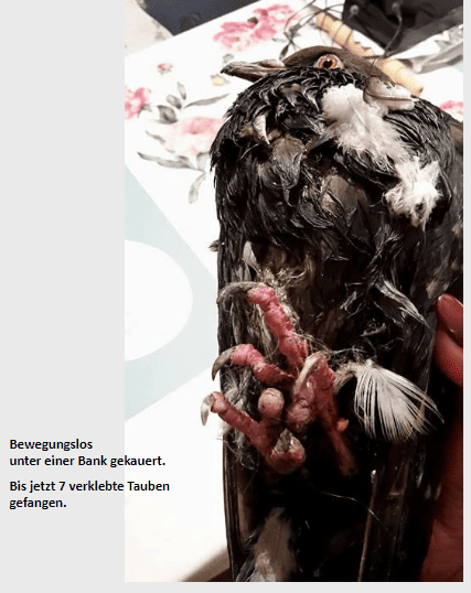 Hersteller dazu, dass Gliedmaßen, Gefieder und/oder Schnäbel der Tauben und anderer Vögel verkleben. Dies bewirkt, dass betroffene Vögel bei der ungehinderten Nahrungsaufnahme und ungehinderten