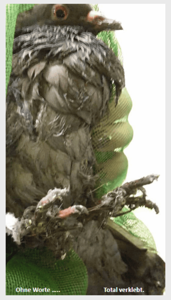 Taube hatte Taubenpaste am Schnabel, Federn an den Flügeln völlig zusammengeklebt, kompletter Bauch, Hals und Beinbereich völlig verklebt.