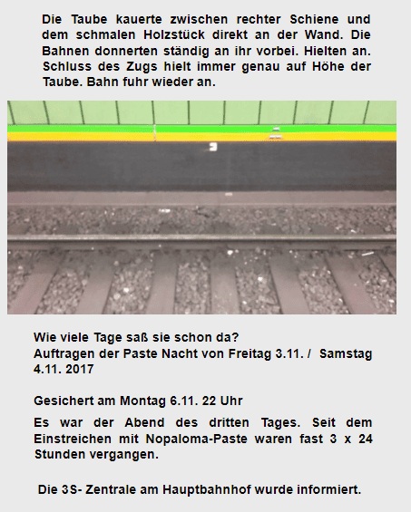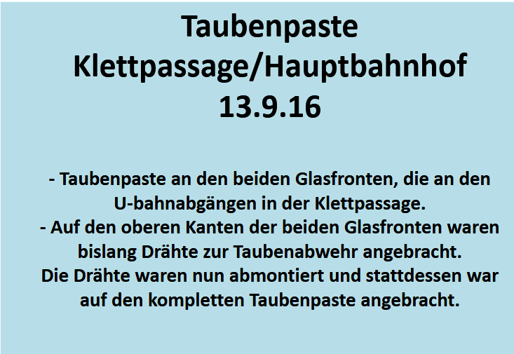 Meldung über etliche verklebte Tiere an der S-Bahnhaltestelle Stadtmitte in Stuttgart. Britta Leins ab 12:30 Uhr vor Ort. 5 verklebte Tauben gesichtet. Alle Tiere mit verklebten