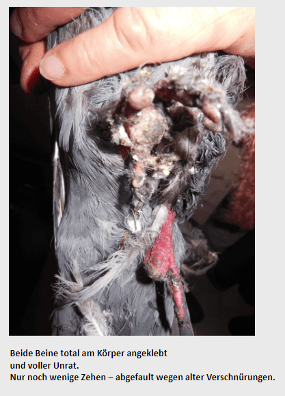 Unrat wie Haare und Dreck, sowie ausgegangene Federn hingen an den Füßen.