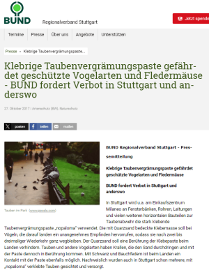 Zeitungsbericht Klebrige Taubenvergrämungspaste gefährdet geschützte Vogelarten und Fledermäuse Okt.2017