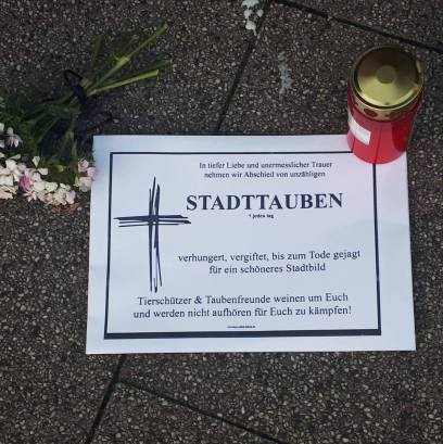 Die Stadttauben in unseren Städten sind obdachlose Haustiere. Die Behörden lassen sie aushungern. Sie finden keine artgerechte Nahrung und füttern wird auch noch bestraft. Man nimmt ihnen jede Lebensgrundlage, vergrämt alles … sie sind gezwungen unter schlimmsten Bedingungen in stetigem Lärm und eng auf kleinstem Platz zu leben… Man begegnet ihnen mit Hass und verfolgt und verletzt sie…
