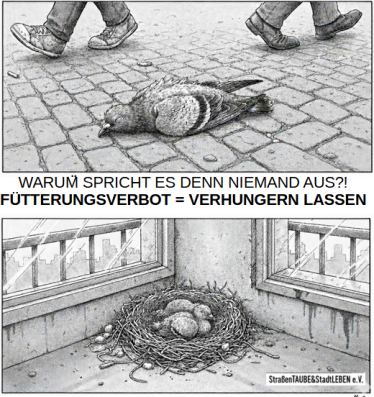 Das sind nur die wesentlichen Folgen! Eine Verminderung der Brutaktivitäten ist damit NICHT verbunden. Im Gegenteil, aufgrund der hohen Sterblichkeitsrate erhöht sich der Druck zur Arterhaltung. Auch fehlt jeglicher Nachweis, dass das jahrelange Fütterungsverbot in irgendeiner Form erfolgreich war. Die Probleme sind eher in jeder Hinsicht größer geworden, vom unermesslichen Leid der Tauben ganz zu schweigen! Im gleichem Atemzug sind auch die Vergrämungsmaßnahmen zu nennen, die alle keine Probleme lösen, sondern nur auf den "Nachbarn" verlagern. Selbst finanziell ergibt das Ganze keinen Sinn. eine "Milchmädchenrechnung", denn gemessen an der Summe aller Aufwändungen können betreute Taubenschläge nur günstiger sein und bieten obendrein eine reale, tierleidfreie Chance, durch Gelegeaustausch die Population in Grenzen zu halten. Der aktuelle Zustand rechnet sich allein für die Taubenabwehr/-vergrämungsfirmen und für Gebäude-/Strassenreiniger mitunter auch für Falkner, die von den Verantwortlichen in den Städten gerne als "Experten" hinzugezogen werden, ähnlich sieht es bei den unsinnigen Umsiedlungsprojekten aus!