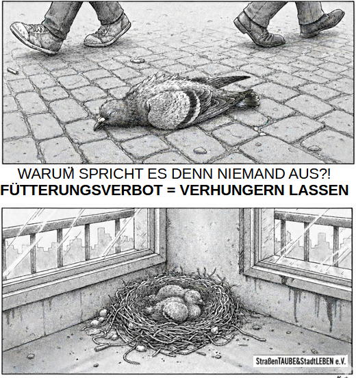 Ein Fütterungsverbot OHNE betreute Taubenschläge bedeutet Populationsregulierung durch HUNGERTOD