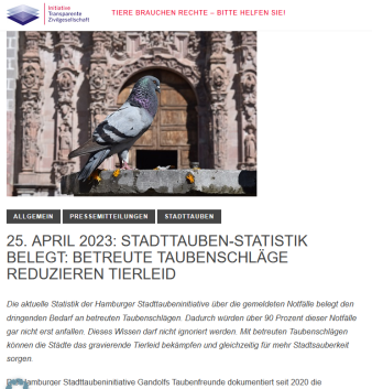 25. April 2023: Stadttauben-Statistik belegt: Betreute Taubenschläge reduzieren Tierleid