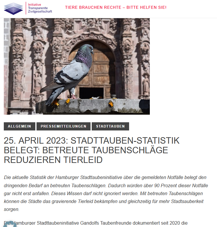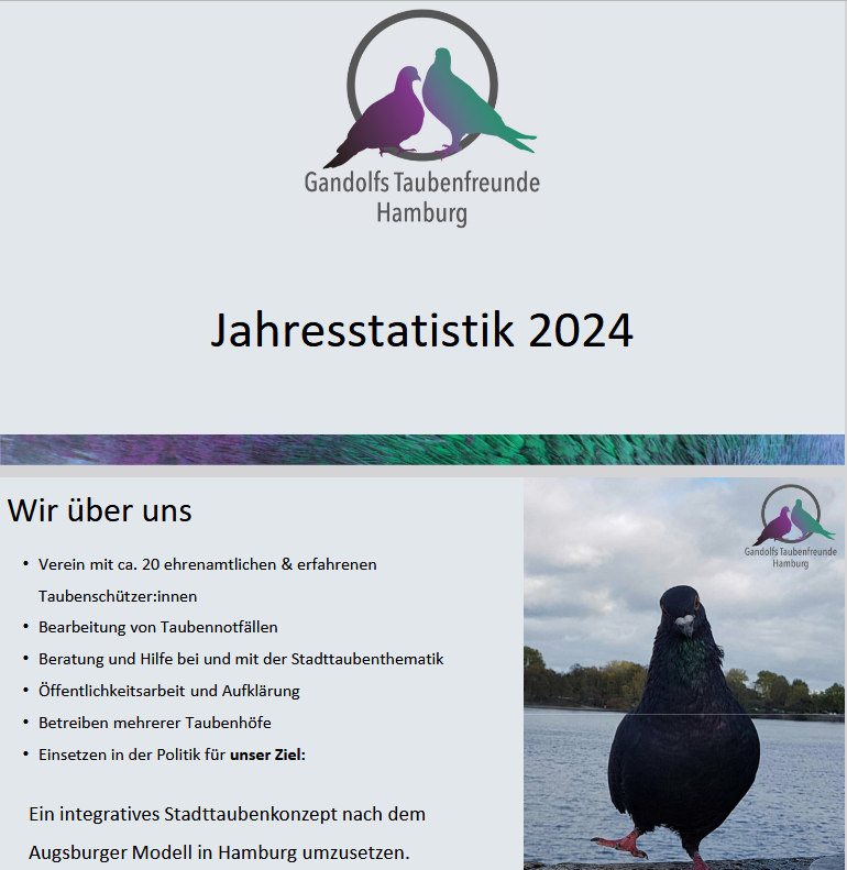 Die Hamburger Stadttaubeninitiative Gandolfs Taubenfreunde dokumentiert seit 2020 die gemeldeten Stadttauben-Notfälle in Hamburg. Die konkreten Zahlen belegen das Ausmaß des Tierleids: Insgesamt waren es 1.544 Notfälle und 300 Totfunde im Jahr 2022. Die Statistik umfasst unter anderem die Diagnosen sowie Auswertungen über Tierarztbesuche, Verbleib und Kosten. Die Ergebnisse belegen die große Zahl von verletzten, geschwächten und toten Tieren, wobei von einer weitaus höheren Dunkelziffer ausgegangen werden muss. Die am häufigsten gemeldeten Notfälle sind Tauben mit verschnürten oder verletzten Füßen, verwaiste Jungtauben sowie geschwächte und verletzte Tiere.