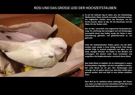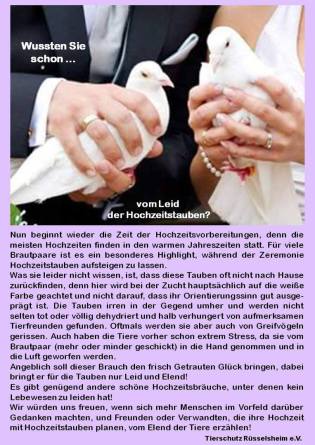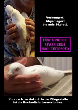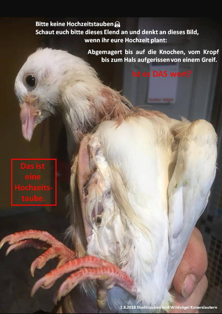 Menschen wollen mit der Hochzeit ihr persönliches Glück feiern. Doch wer sogenannte Hochzeitstauben fliegen lässt, fügt den betroffenen Tieren großes Leid zu. Die Tauben werden ihrem Heimatschlag entnommen und zu einem für sie unbekannten Ort transportiert. Sie müssen in kleinen Boxen ausharren, werden häufig von fremden Menschen in die Hand genommen – was für die Tiere extrem strapazierend ist – und schließlich fliegen gelassen.(Text PETA)