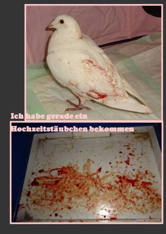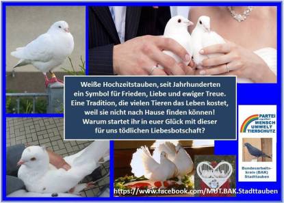 Abgesehen vom grundsätzlichen Tierleid, das den Tauben dabei zugefügt wird, ist es sicherlich ein schlechtes Omen, ein Taubenpaar auseinanderzureißen, um einen der Partner als Glücksbringer für die eigene Hochzeit zu missbrauchen.(Text PETA)