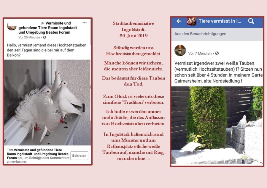 Spaziergänger:innen finden immer wieder weiße „Ziertauben“, die orientierungslos und ausgehungert herumirren. Mit hoher Wahrscheinlichkeit wurden diese Tiere im Rahmen von Hochzeiten fliegen gelassen. Nach dem sogenannten Auflass an einem ihnen unbekannten Ort fehlt den Tauben die Orientierung. Sie verlieren den Anschluss an ihre Artgenossen und finden häufig nicht mehr zurück zum Heimatschlag. Diese „Hochzeitstauben“ sind in der Natur und in städtischer Umgebung nicht überlebensfähig – sie verhungern oder verdursten meist qualvoll, sterben an Schwäche oder werden von Greifvögeln getötet.