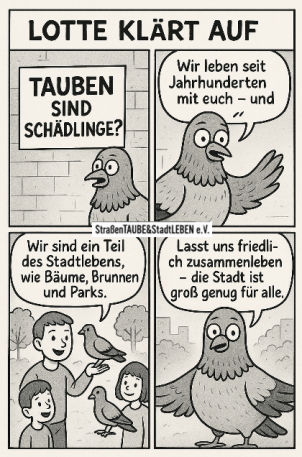 Es ist mittlerweile erwiesen, dass Taubenkot nicht materialschädigend ist (s. TU Darmstadt, Prüfungsbericht 2004) und das von Tauben keine größeren gesundheitlichen Gefahren ausgehen, als von anderen Vögeln und Tieren auch.