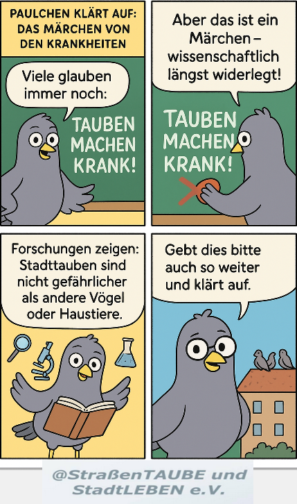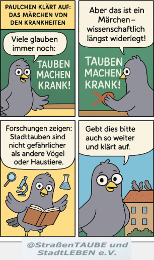 Es ist mittlerweile erwiesen, dass Taubenkot nicht materialschädigend ist (s. TU Darmstadt, Prüfungsbericht 2004) und das von Tauben keine größeren gesundheitlichen Gefahren ausgehen, als von anderen Vögeln und Tieren auch.
