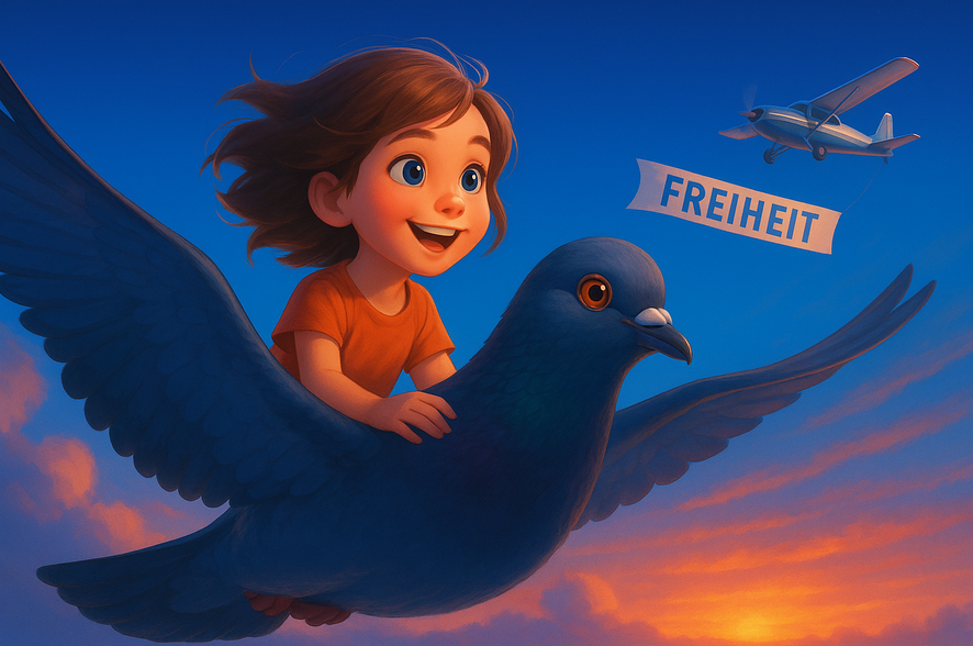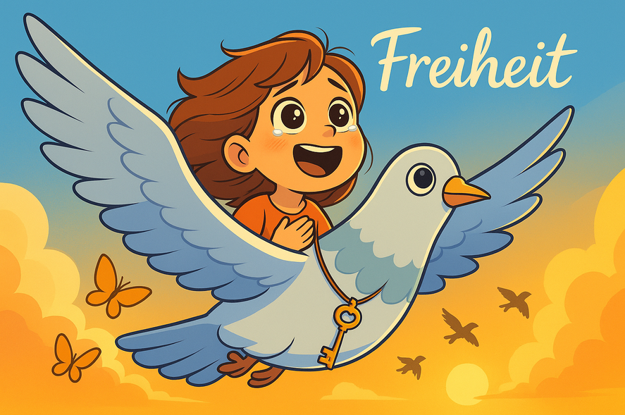 Sie flogen über graue Dächer, über Flüsse, Felder, Wälder – und als sie durch die Wolken brachen, da stand es am Himmel, gemalt aus Wind und Hoffnung: „Freiheit“.