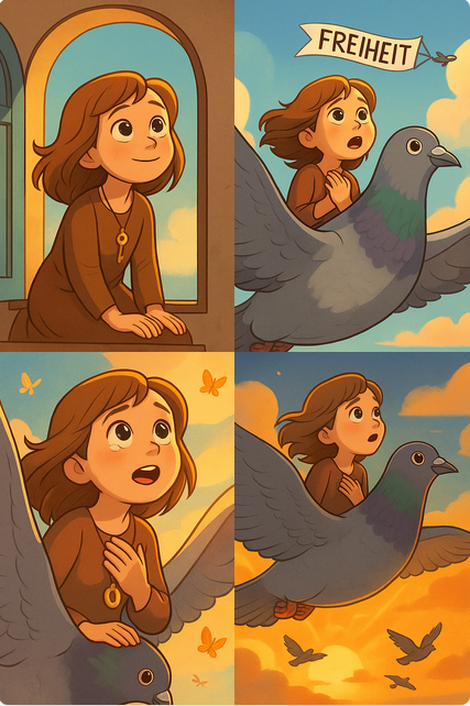 Tag für Tag pflegte Lina das Tier, und mit jedem Flügelschlag, der stärker wurde, wurde auch Linas Mut größer. „Wenn du wieder fliegen kannst“, flüsterte sie der Taube zu, „dann nimm mich mit. Weit weg. Dorthin, wo es hell ist.“