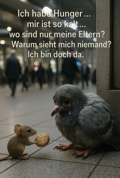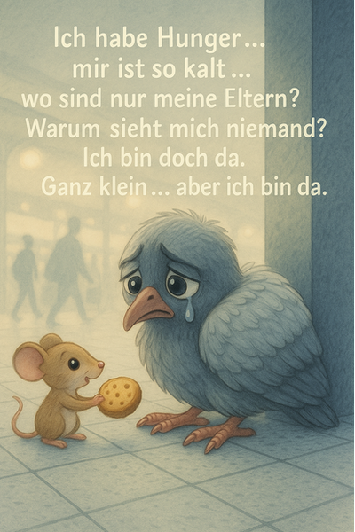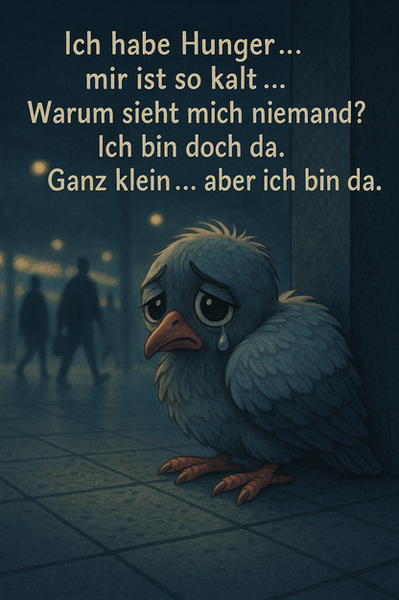 Darin lagen drei Küken. Zwei waren still. Ihre kleinen Körper kalt, ihre Augen geschlossen wie nie geöffnete Fenster zur Welt. Das dritte – das letzte – reckte seinen Hals nach oben, sein winziger Schnabel weit geöffnet, hungrig, hoffend, bettelnd. Doch es kam kein Flügelschlag, kein Futter, kein Trost. Nur Wind, der durch die Gassen zog wie ein Lied ohne Melodie.