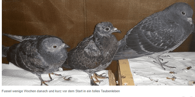 3,5 Wochen später wachsen bei Fussel nun endlich nach hingebungsvoller Pflege die ersten Federchen an den kahlen Stellen. Er hat an Gewicht zugelegt und ist ein freudiges und aufgewecktes Taubenkind geworden. Wenn er ausgewachsen und vollständig gesund ist, darf er mit seinen beiden Freunde in einen betreuten Taubenschlag umziehen.