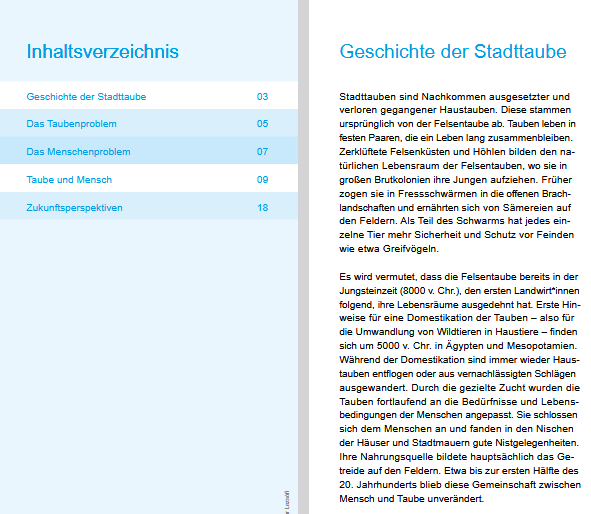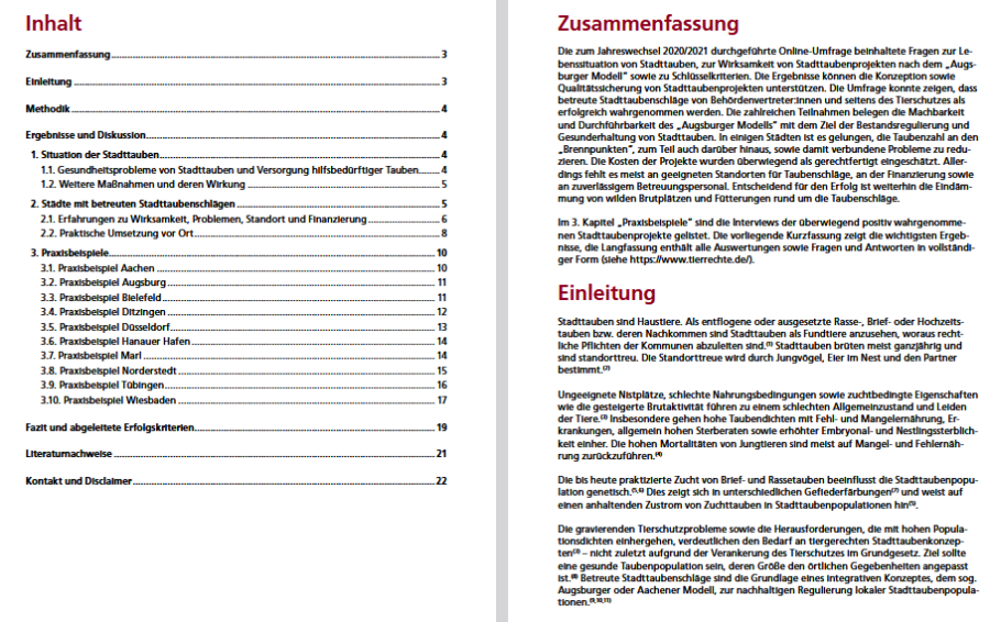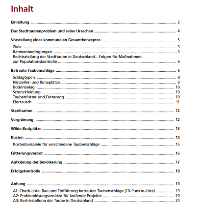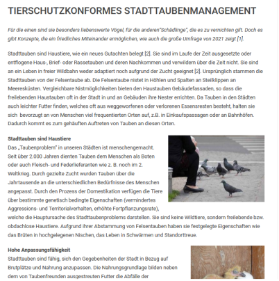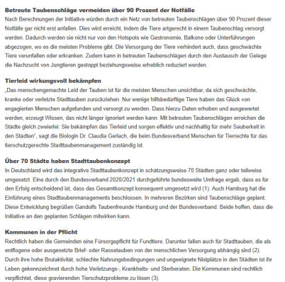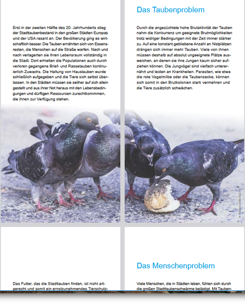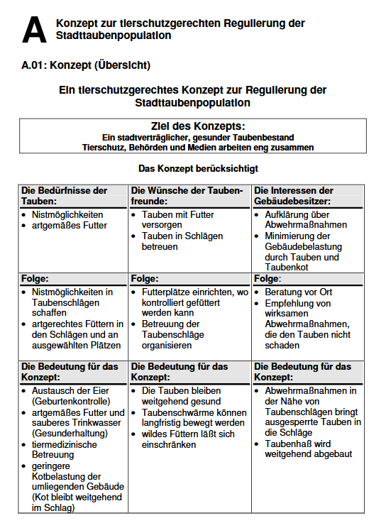 Informationspappe Konzept zur tierschutzgerechten Regulierung der Stadttaubenpopulation Auszug der PDF von Menschen für Tierrechte