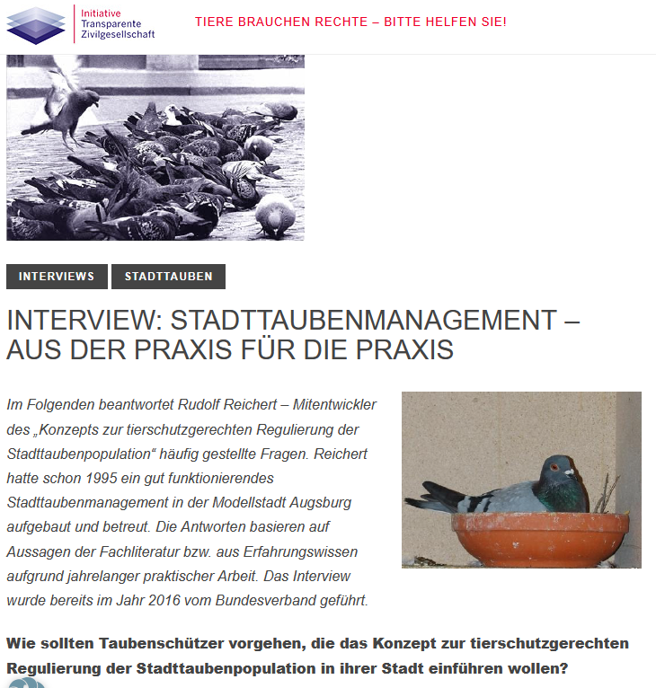 Ganzer Artikel Interview Menschen für Tierrechte und Rudolf Reichert: https://www.tierrechte.de/2021/02/05/interview-stadttaubenmanagement-aus-der-praxis-fuer-die-praxis/