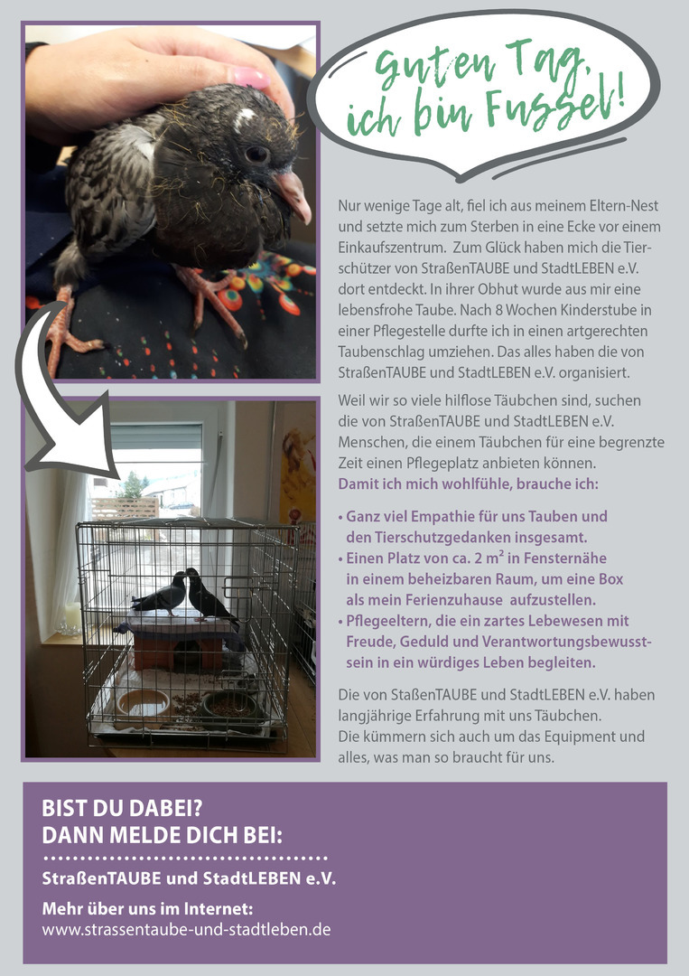 Eine besonders große Hilfe ist Ihre Bereitschaft, für eine begrenzte Zeit einem Tauben-Findling eine Pflegestelle anzubieten. Täubchen Fussel erzählt, worauf es ankommt.